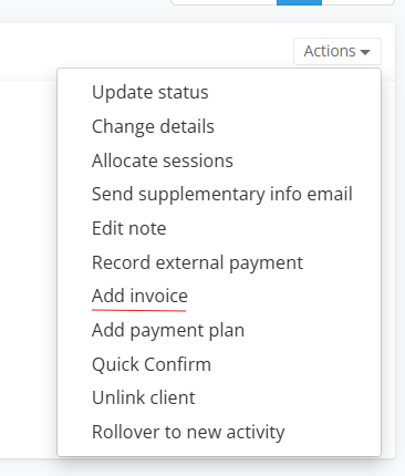 To create an invoice for payment. Select on Actions and Add Invoice