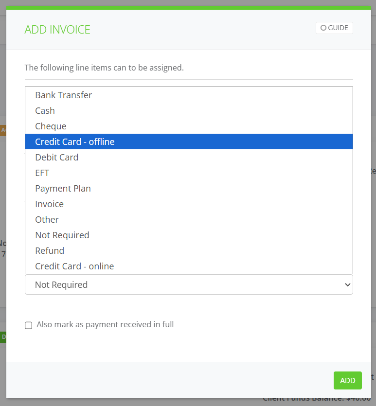 5. Choose the Payment Type eg Credit Card - online and select Add