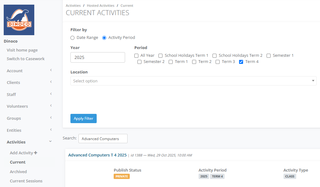 From the Frontdesk, go to Activities then Current and then Search for your Class and select Edit