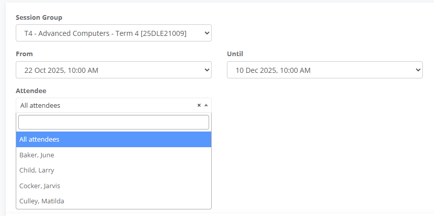 Select the From and Until dates to show all sessions within this timeframe for your attendance list. OR find a specific student by searching the Attendee dropdown list.