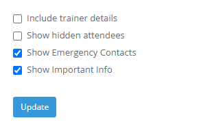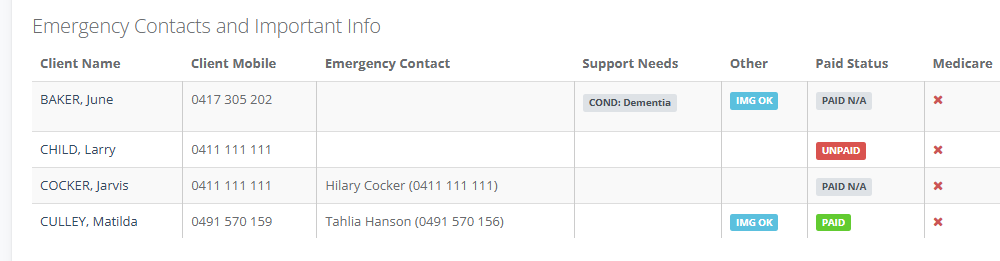 Where Emergency Contact and Show Important Info is selected this information will be displayed underneath the attendance roll. It displays student name, mobile, emergency contact, support needs, consents (ie Image) and Medicare.
