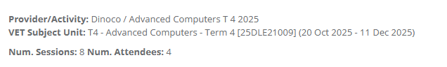 The Sheet shows the provider and class name, the VET Subject Unit linked to the class, number of sessions and number of attendees.