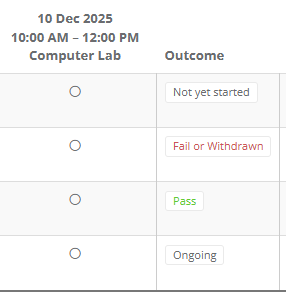 For Learn Local classes, go to the Outcomes tab and select on Not yet started and change to Ongoing, Pass or Withdrawn