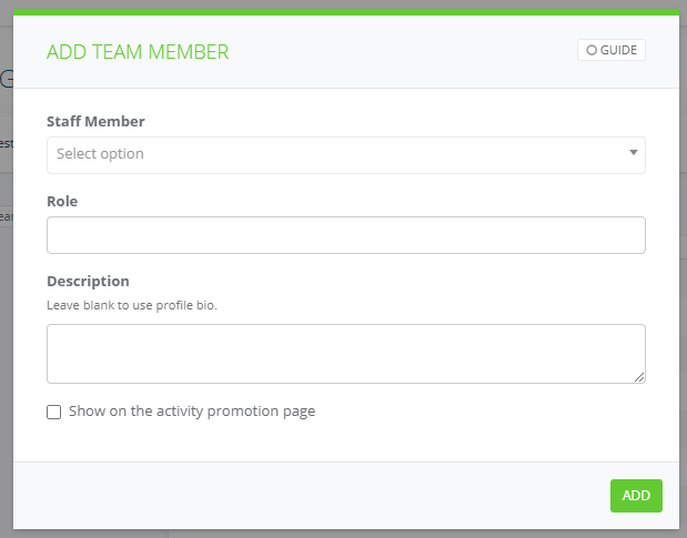 4. From the Staff Member List select the trainer, enter a Role ie. Staff, tick Show on the activity promotion page and select Add