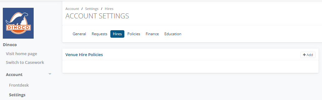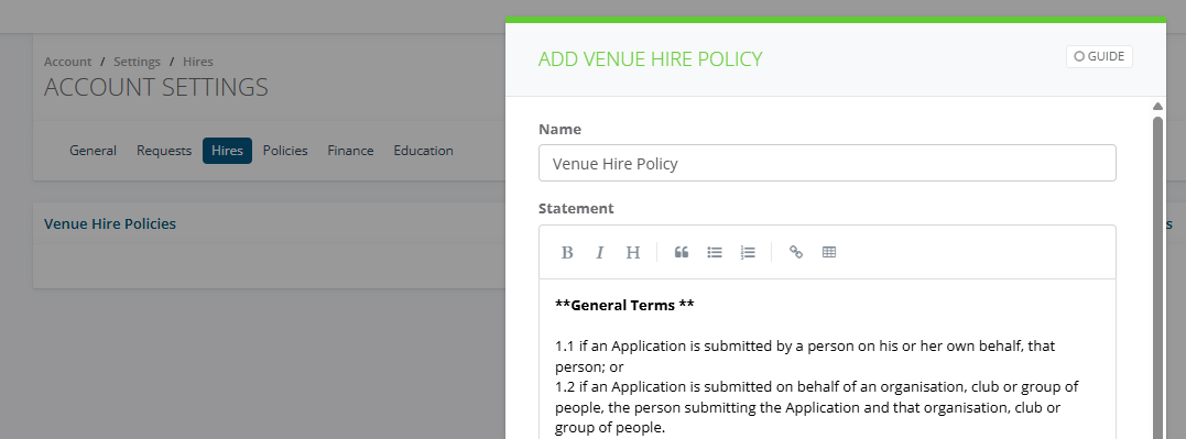 To add a Venue Hire Policy, click +Add enter your Policy use the editing feature to bold, italic your policy.