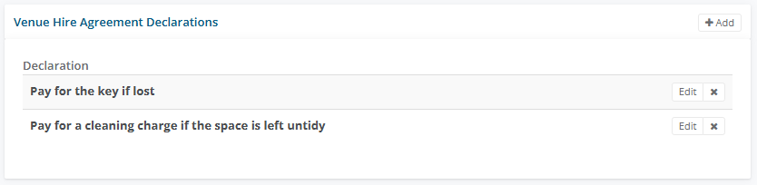 Add specific declarations that a hirer must agree too. Go to you the Venue Hire Agreement Declarations pane and select +Add