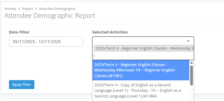 - Filter by Date Range or Activity Selection, select individual or multiple classes that you want student demographics for