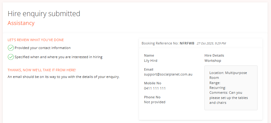 - A hirer has completed an Expression of Interest Venue Hire Booking