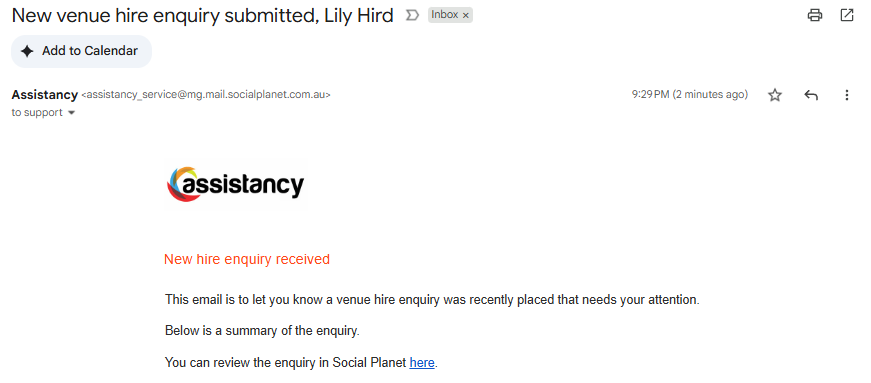 - The Centre will receive a Venue Hire Email Notification will be sent. Select on Here