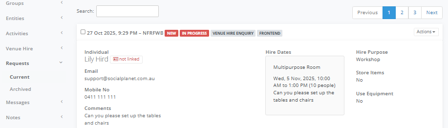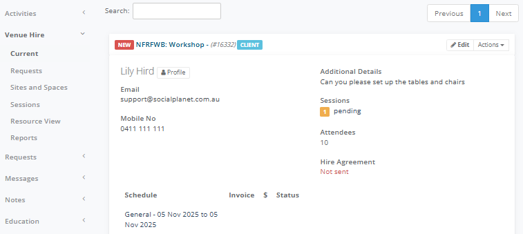 - Under Request > Current. The venue hire booking will be displayed with New and In Progress labels.