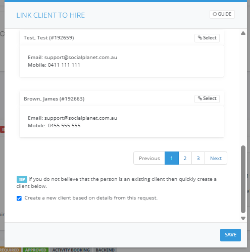 - Select on Not Linked and the system will first do a look up to see if there are existing clients with matching names, email and mobile. If they already exist click on Select.