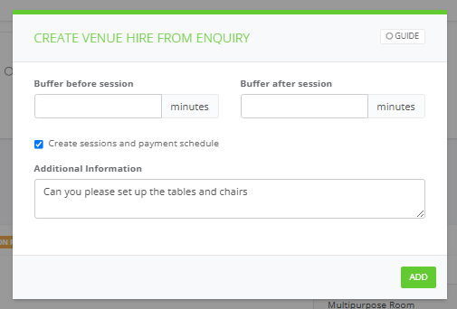 - In the Create Venue Hire From Enquiry display enter a buffer time, tick Create sessions and payment schedule, review Additional Information and select Add