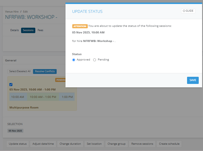 - Go to the Sessions tab, select on the Session then Update Status select on Approved then Save