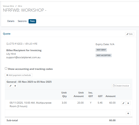 - Go to the Fees tab, review the Payment Schedule and select Create Invoice