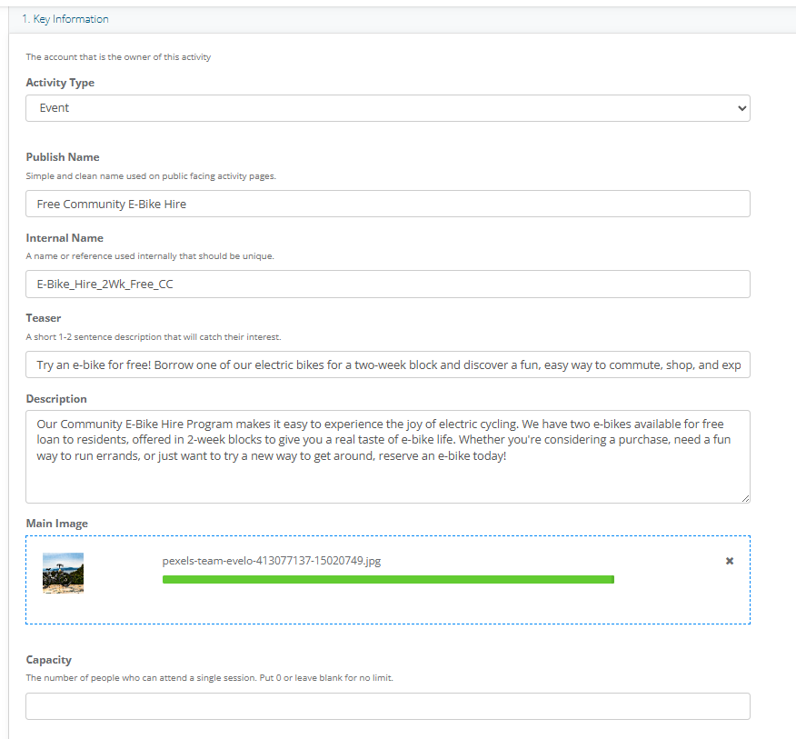 2. Enter the Key Information as shown below. Leave Capacity Blank.