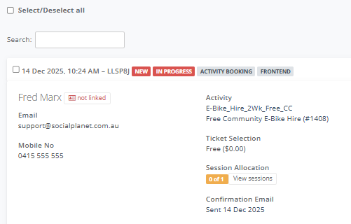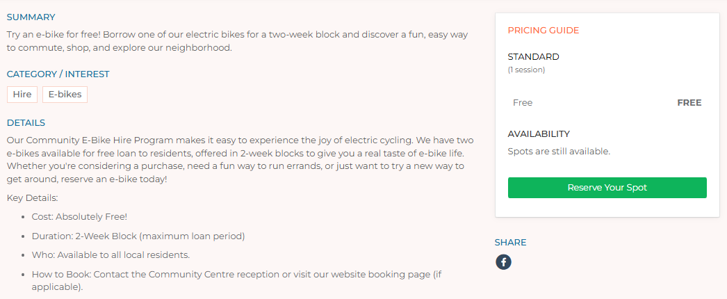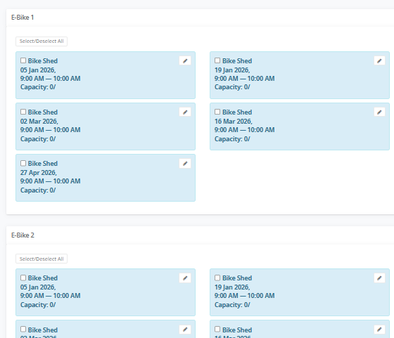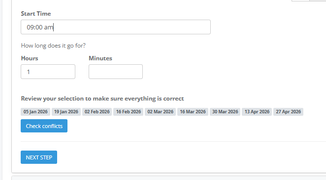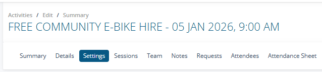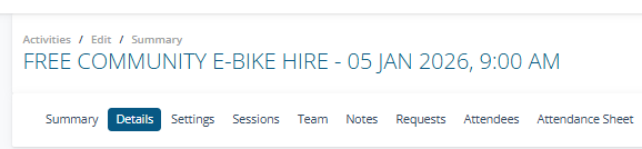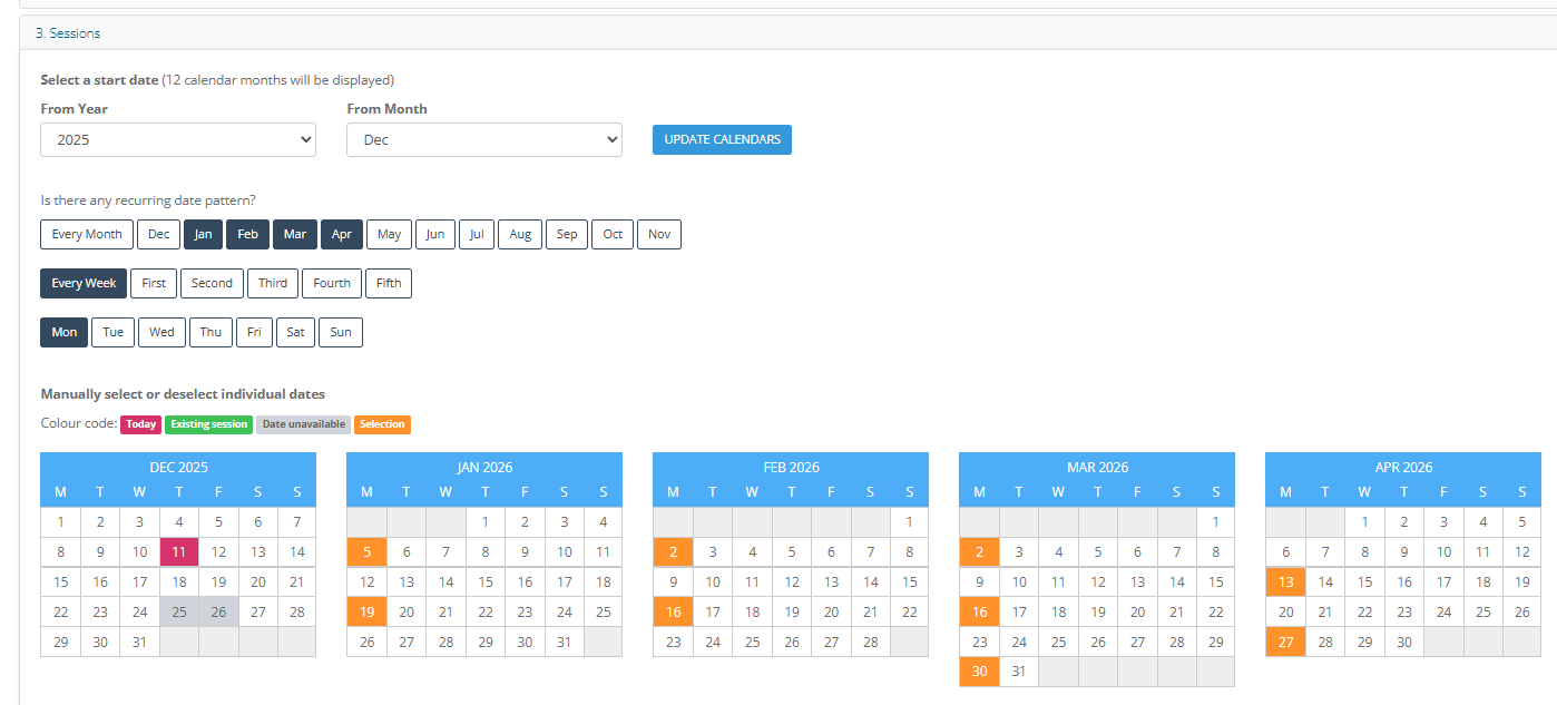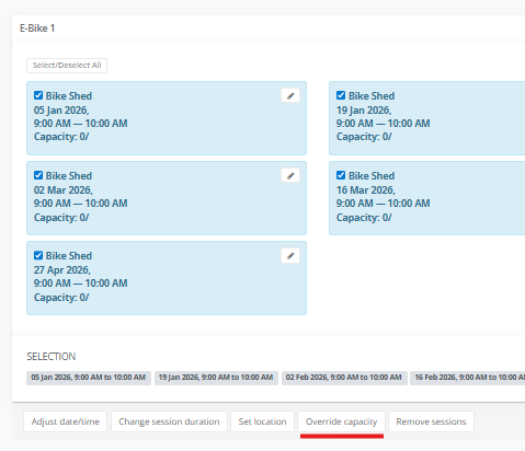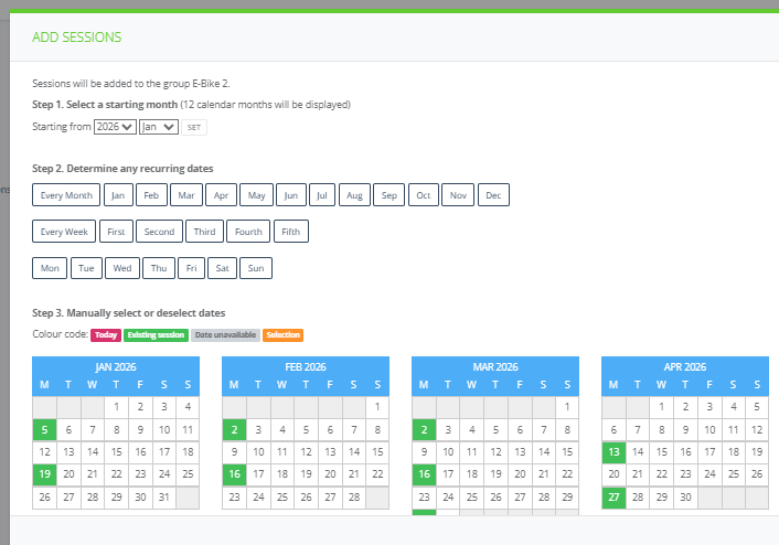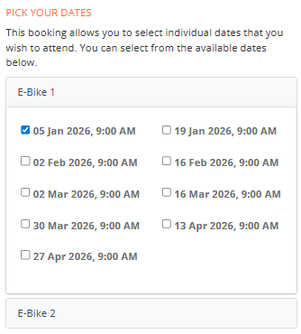 4. In Sessions, enter the session dates. I've made the sessions two weeks apart so the hirer can book the bike for two weeks.
