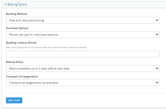 6. Set the Booking Method eg. Free with Required Booking and Person can pay for individual sessions